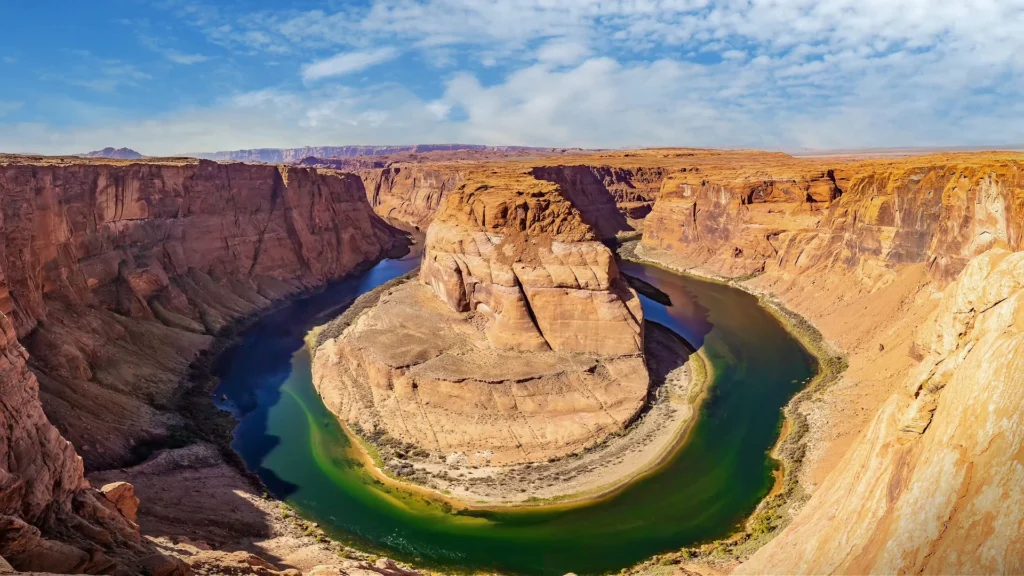 Located just downstream from the Grand Canyon. This 270-degree curve of the emerald-green Colorado River is carved into brilliant red sandstone.