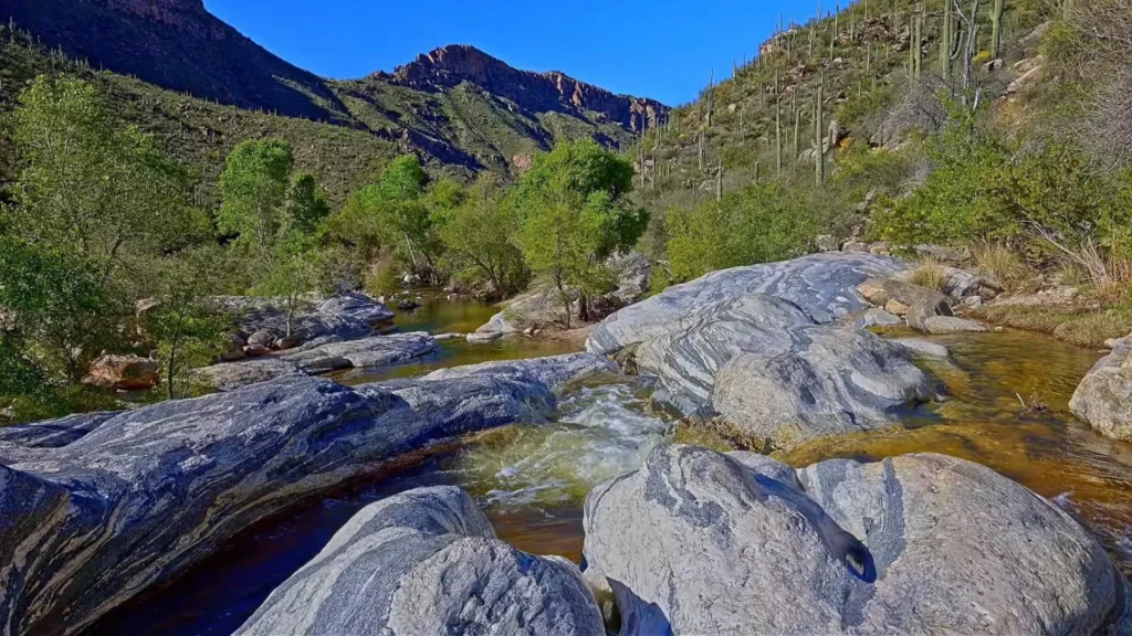 This was once submerged under a prehistoric sea. Today, it’s an arid oasis located in the Santa Catalina Mountains and the Coronado National Forest north of Tucson. Water flows here year-round, sustaining lush greenery, waterfalls, and pools where you can escape the desert heat.